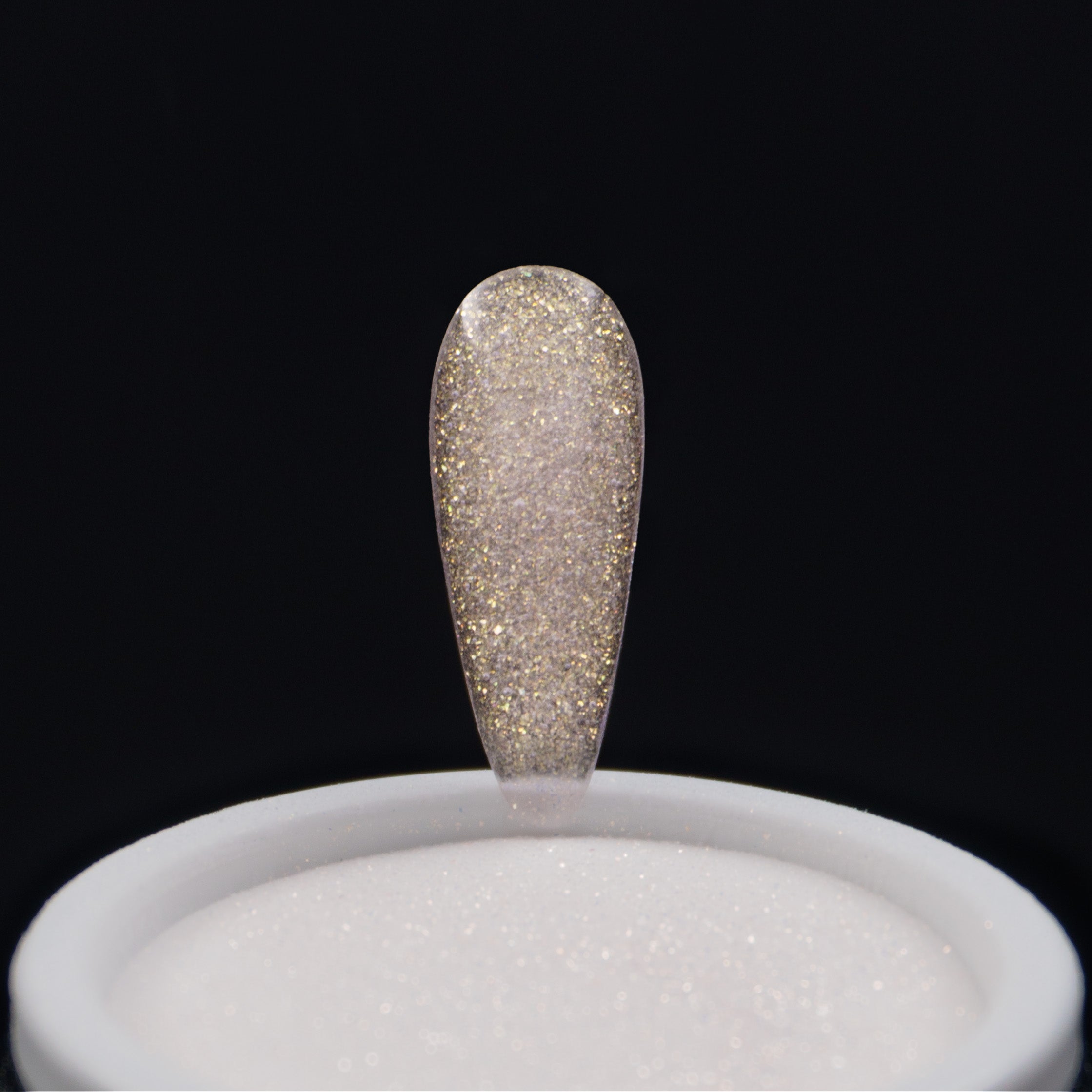 Pó acrílico transparente com purpurinas finas douradas. Contém grãos de acrílico de vários tamanhos, tornando-se por isso mais resistente. Não cria bolhas de ar durante a aplicação.